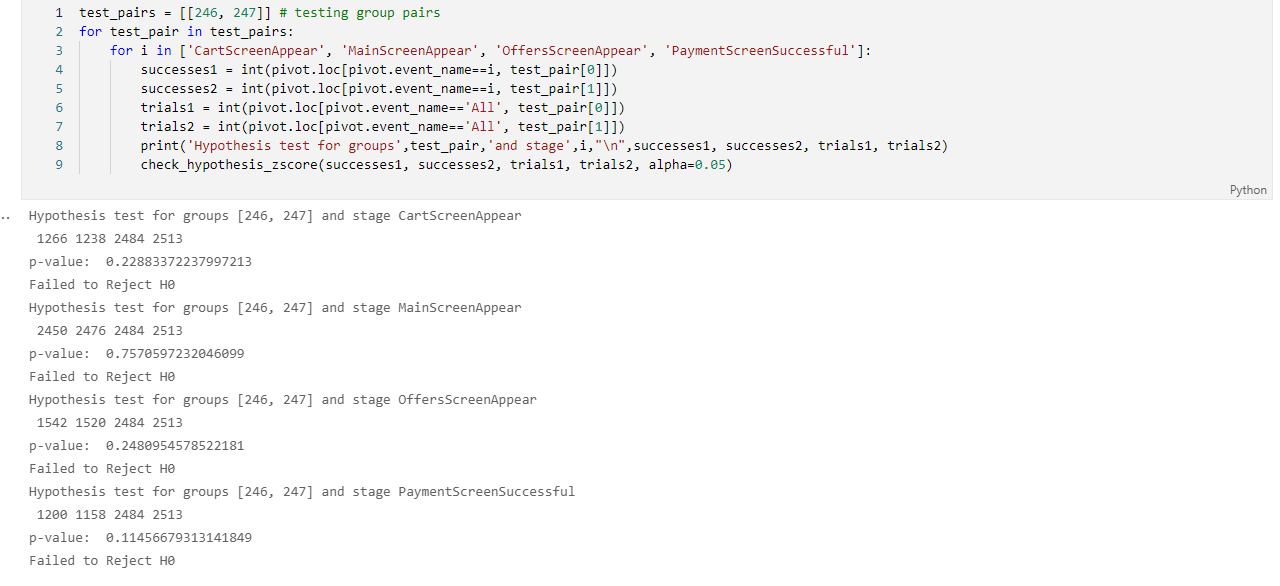 MainScreenAppear is the most popular event in both control groups. For group 246, 2450 users performed that action and for control group 247, 2476 users performed the same action. 98 % of total users of each group have performed this action. The outcomes tells us that the groups were split properly since we failed to reject the null hypothesis that implied there is statistically significant difference between groups.