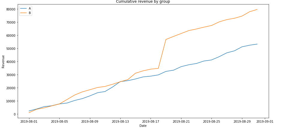 The graph below illustrates the revenue of two groups for a period of a month. From August 2019 to September 2019. Revenue is rising steadily throughout the whole test in both groups. That’s a good sign. But we can see a hughe spike from 30k to 50 in revenue after the second week of testing. Thats clearly a sign that has worked sucessfully resulting in higher revenue for group B.